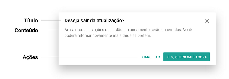 Desde o início, deixe claro qual o objetivo do diálogo e porque ele se encaixa dentro do contexto ao qual está sendo exibido. Procure orientar sobre qual será o resultado das ações que o usuário venha a adotar, sejam elas no sentido de seguir o fluxo proposto (caminho feliz) ou deixar para executar a ação mais tarde.