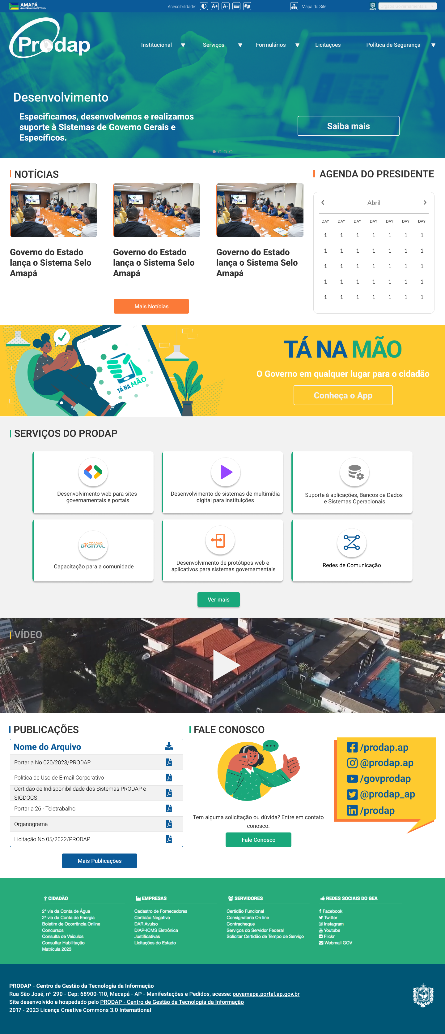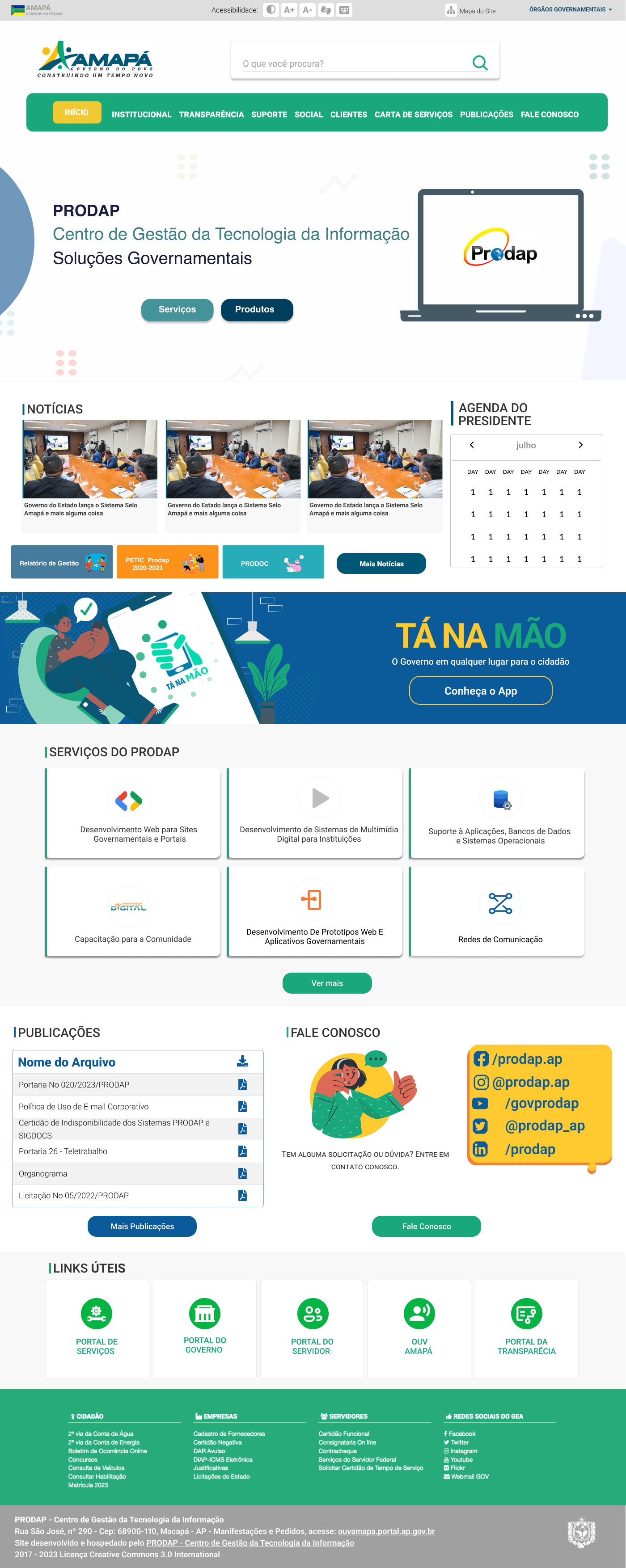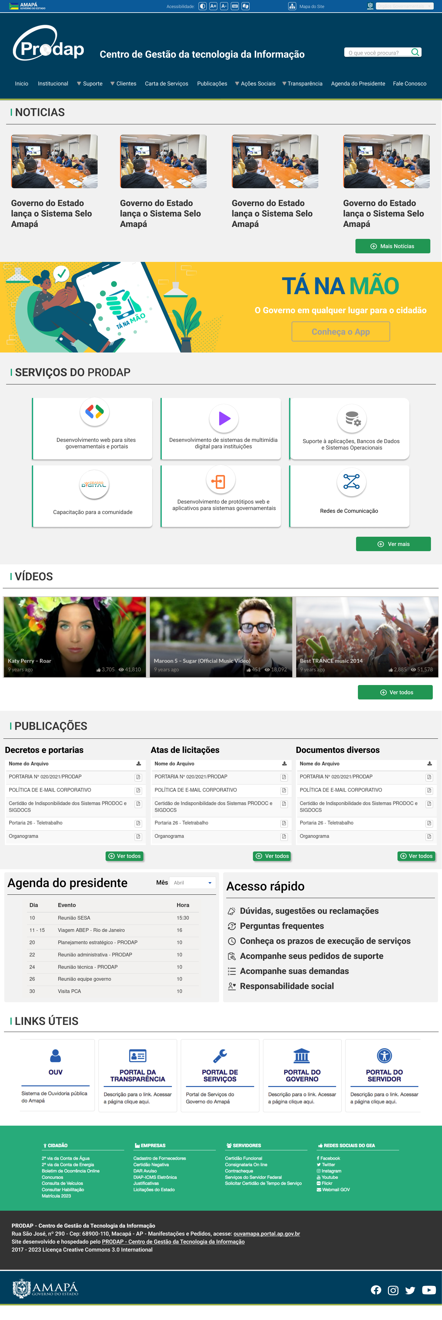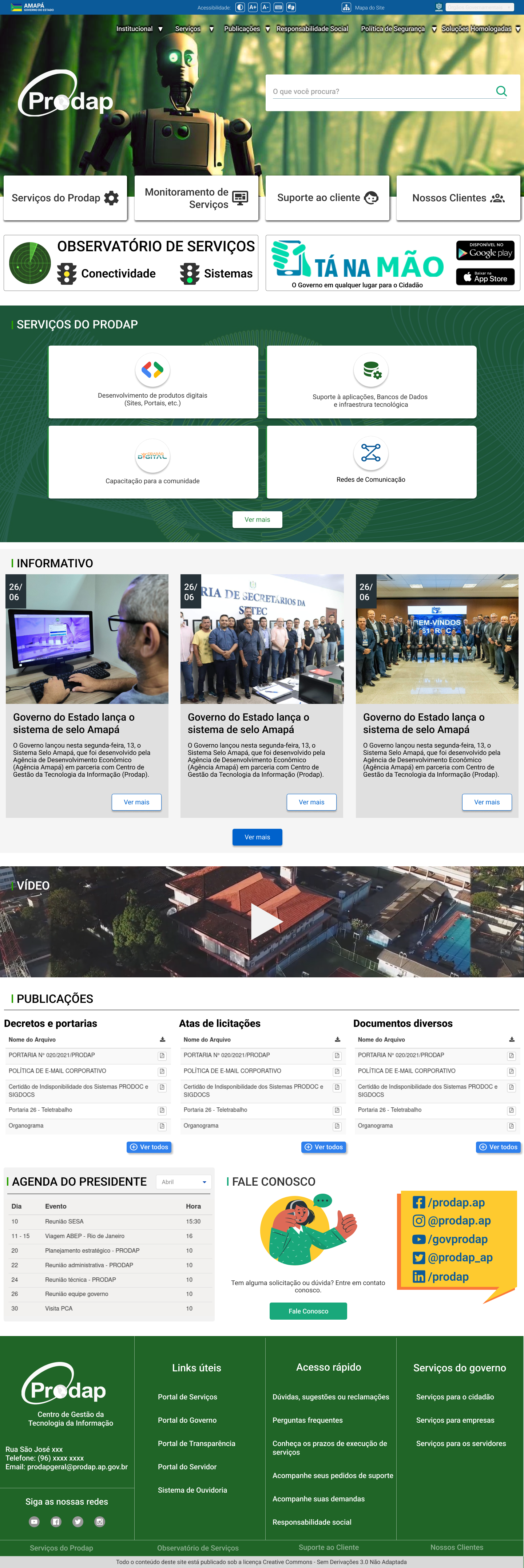 Fechando o site, uma linha com a "Agenda do presidente" (transparência), "Aplicativos para você" (com os Apps do GEA) e indicadores dos serviços digitais do GEA (área "Serviços no Portal").