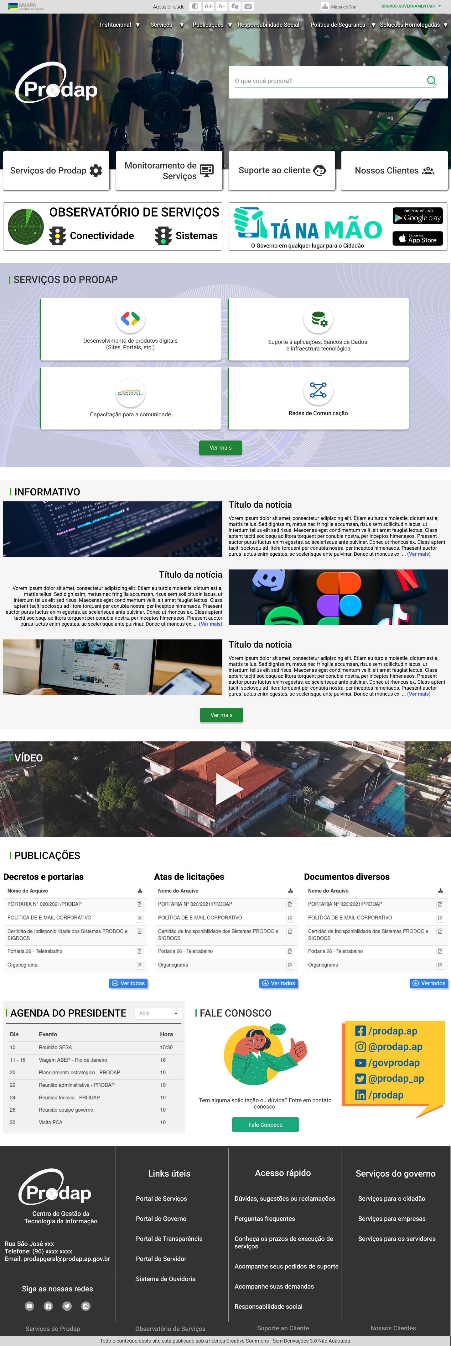 Concluindo, foi criado um novo padrão de rodapé, com sessões bem definidas: uma institucional (inclui as redes sociais), uma com links úteis, acesso rápido e serviços do governo com links à partir das categorias definidas no portal de serviços (Cidadão, Empresa e Servidores). A última linha do rodapé repete os links a áreas mais destacadas do site.