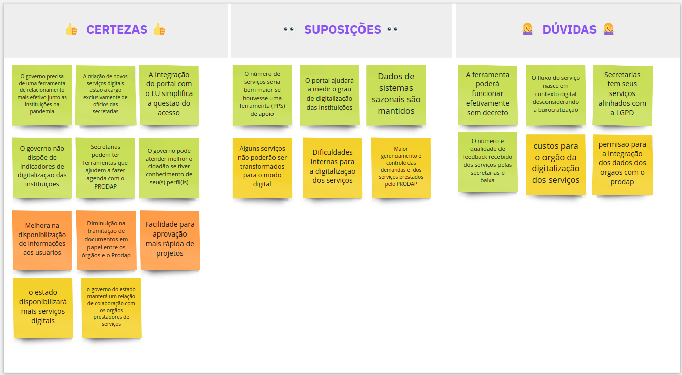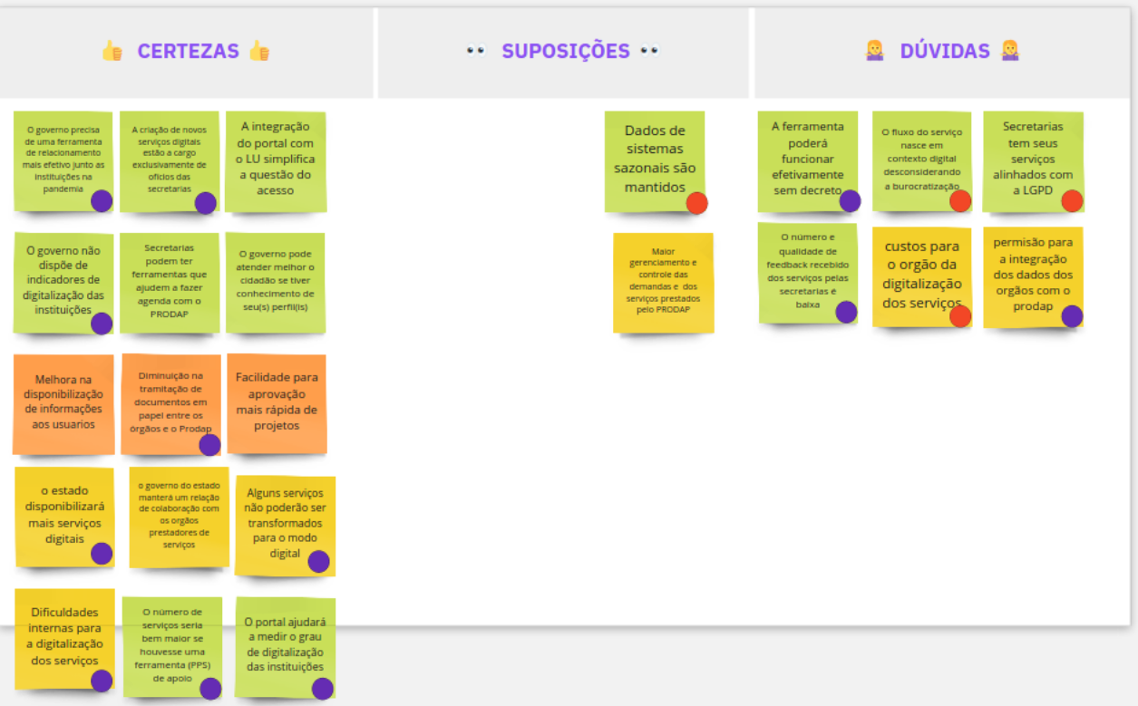 Com o novo quadro, foi possivel verificar que as certezas foram ampliadas, restando poucas suposições e dúvidas. Estas não seriam descartadas, pois precisam ser esclarecidas até o final do processo, o que pode ser feito via as histórias de usuário ou na composição do MVP.