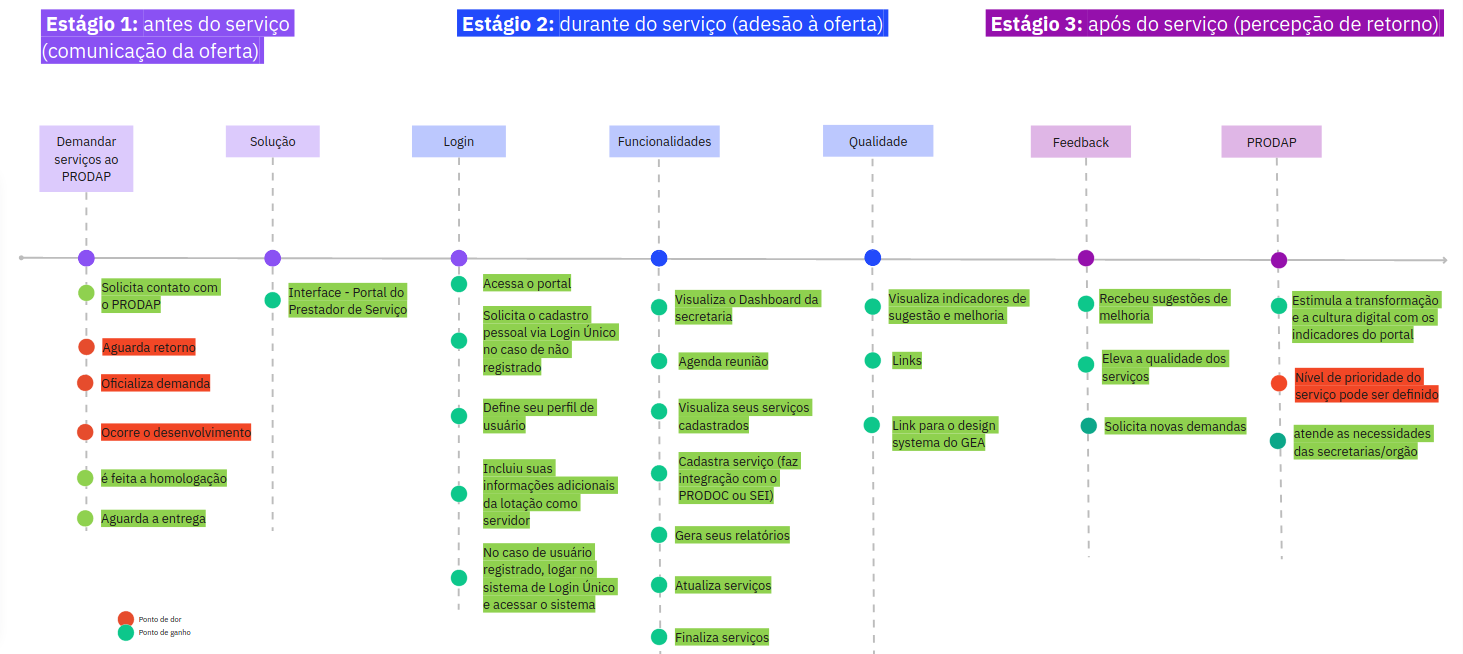A partir de cada marco em seus respectivos estágios, é possível fazer a leitura de cada procedimento em ordem de ocorrência que será precorrido pelo usuário. Cada um deles sinalizado por uma cor: verde (ponto de ganho) ou vermelho (ponto de dor)