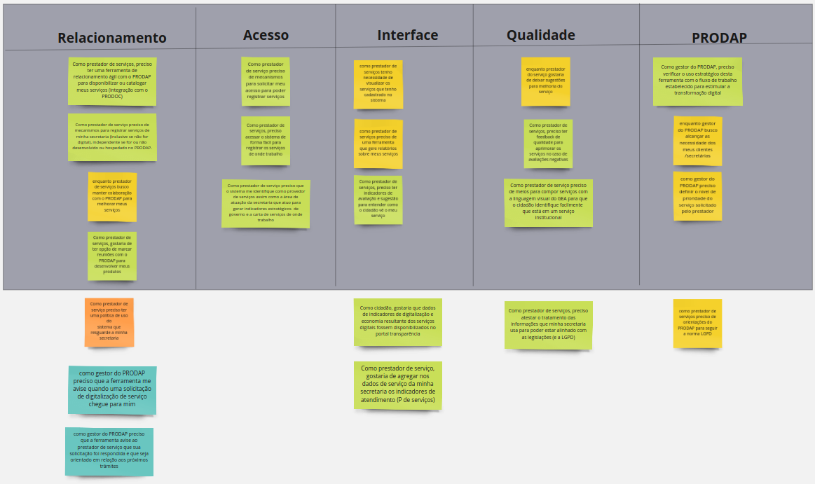 Foram encontrados 5 grandes grupos: relacionamento, acesso, interface, qualidade e PRODAP (com recursos e acessos a dados específicos)