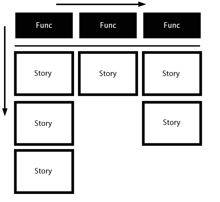 Todas as histórias de usuários devidamente agrupadas em grupos por assunto ou funcionalidade, são colocadas em ordem de importância da esquerda para direita (assunto) e de cima para baixo(histórias de usuário), conforme a ilustração abaixo: