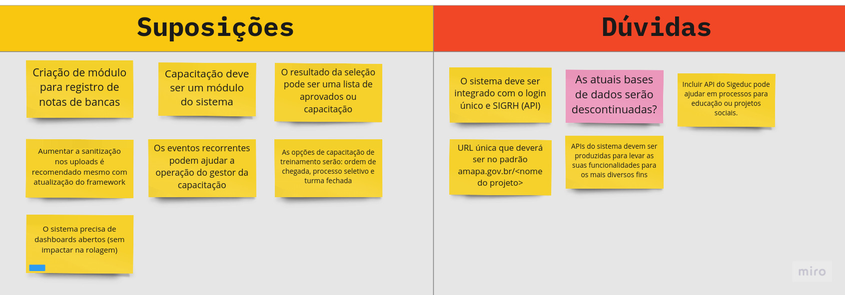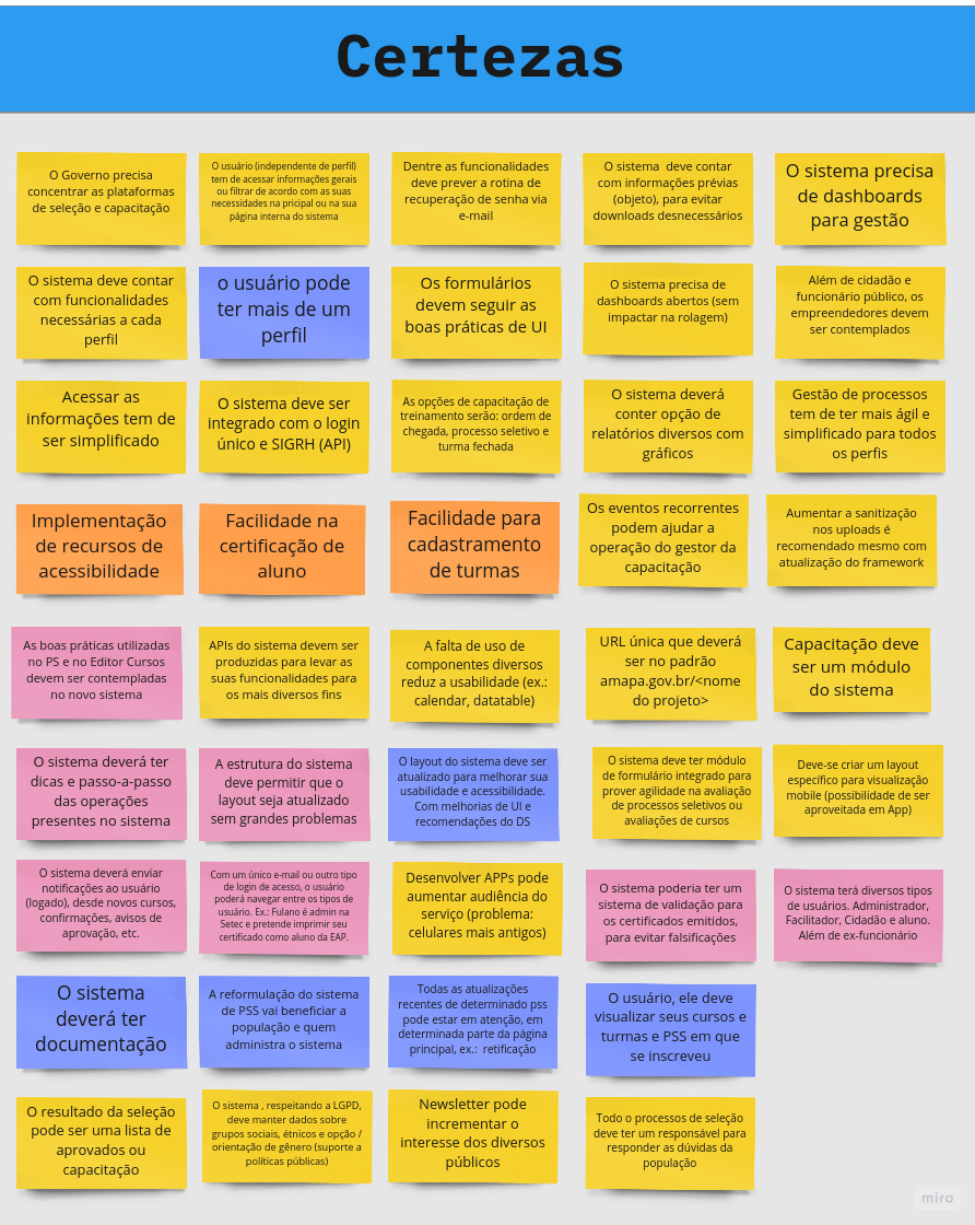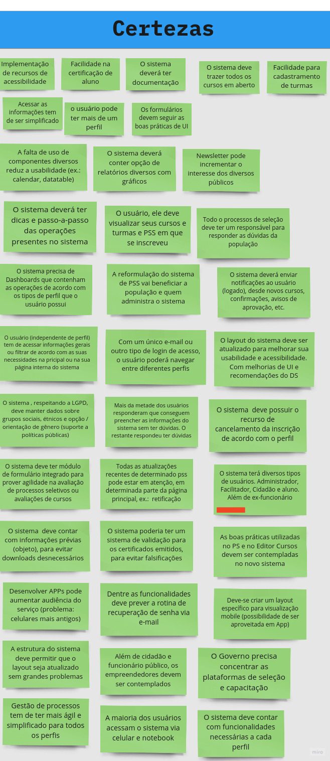 Com o novo quadro, foi possivel verificar e qualificar as certezas, assim como readequar ou reposicionar itens nas suposições e dúvidas. Estas não seriam descartadas, pois precisam ser esclarecidas até o final do processo, o que pode ser feito via as histórias de usuário ou na composição do MVP, caso contrário, reavaliado para a próxima versão do sistema.