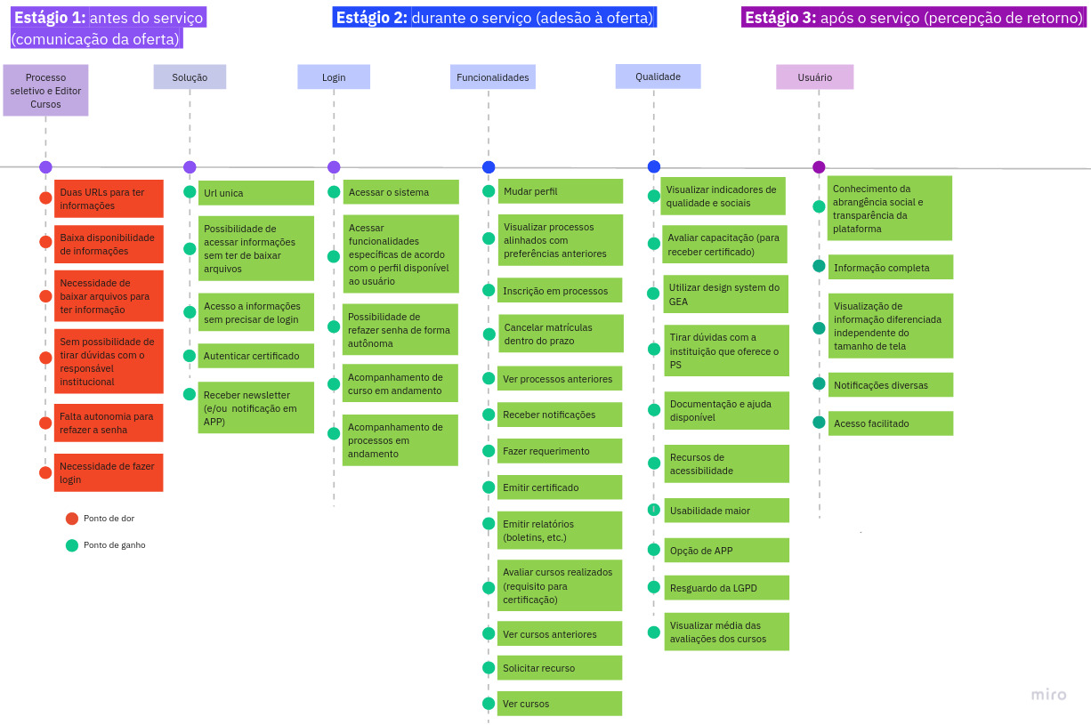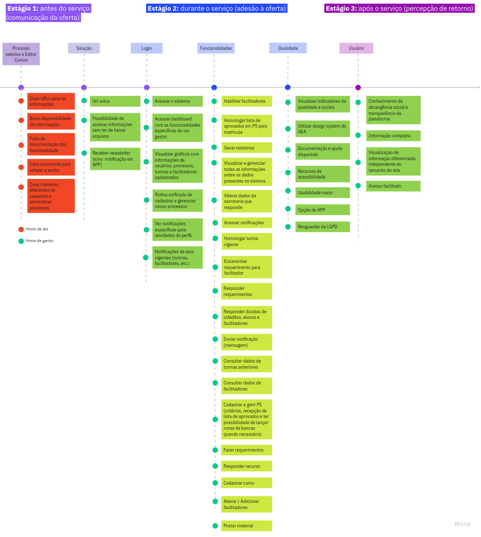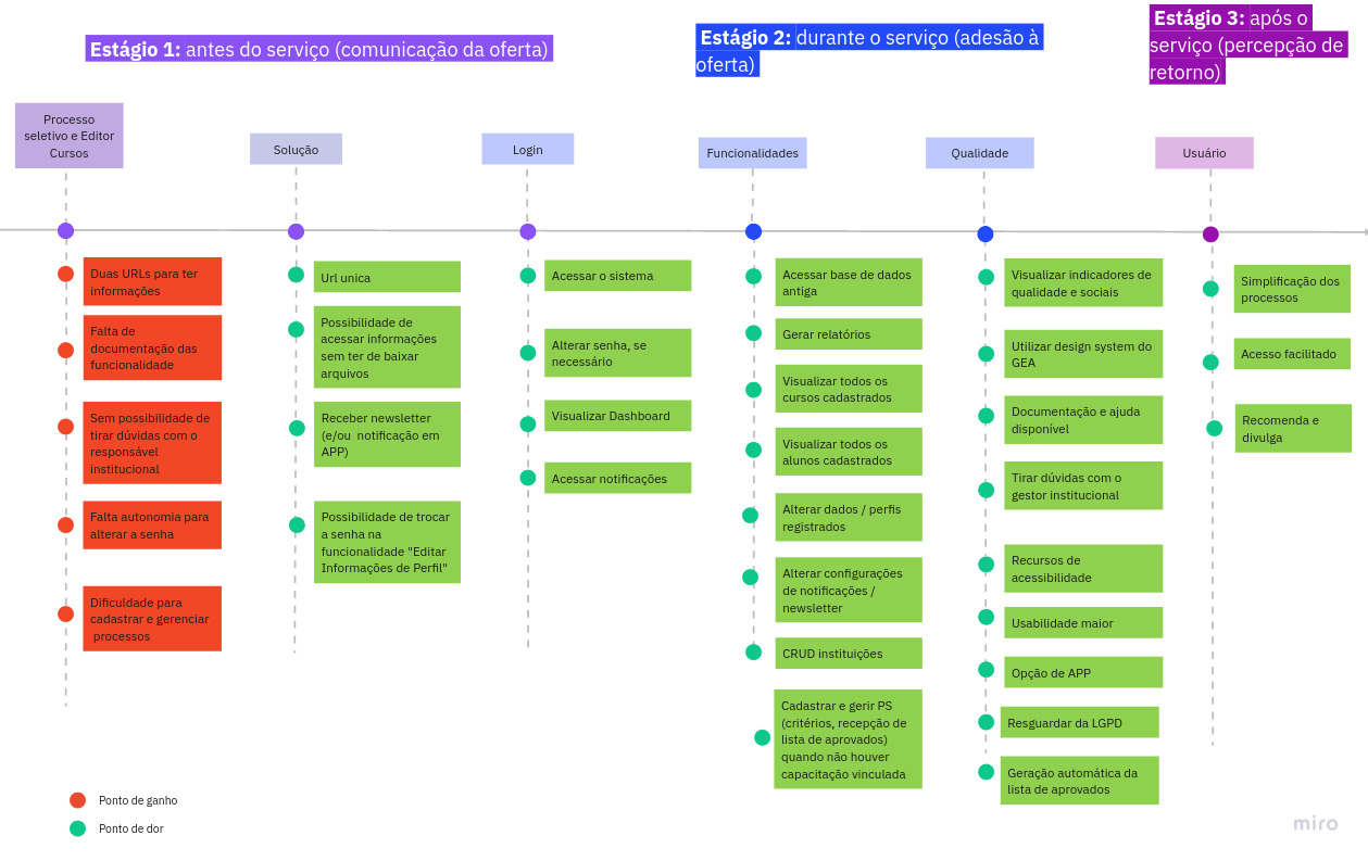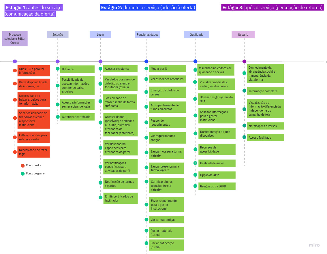A jornadada foi composta em 3 fases ou estágios: antes da oferta do serviço; durante o uso; e, pós uso