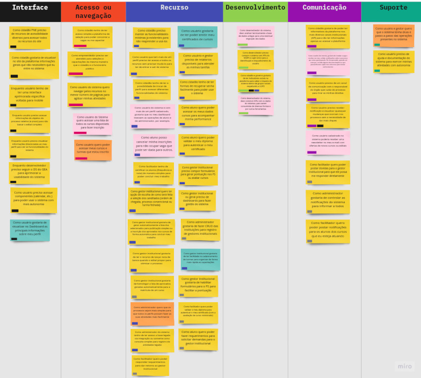 Foram encontrados 6 grandes grupos, relacionados por ordem de importância: Interface, Acesso ou navegação, Recurso, Desenvolvimento, Comunicação e Suporte.