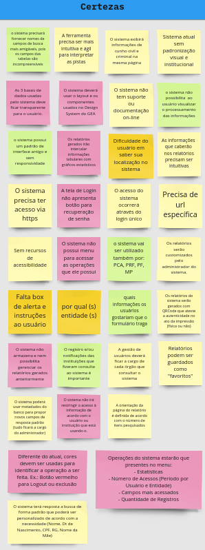 Este quadro inicia o desenvolvimento específico das Ferramentas de UX. Após um processo um brainstorm da equipe todas as ideias foram enquadradas em uma das colunas da matriz. Em virtude da coluna com mais conteúdo ser a certeza, mostraremos em destaque e pontuaremos os conteúdos das demais colunas.