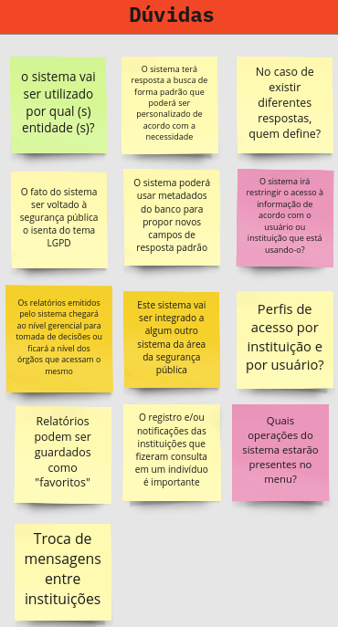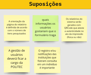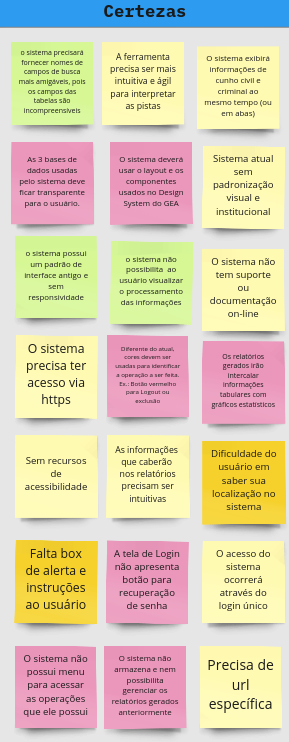 Com o novo quadro, foi possivel verificar e qualificar as certezas, assim como readequar ou reposicionar itens nas suposições e dúvidas. Estas não seriam descartadas, pois precisam ser esclarecidas até o final do processo, o que pode ser feito via as histórias de usuário ou na composição do MVP, caso contrário, reavaliado para a próxima versão do sistema.