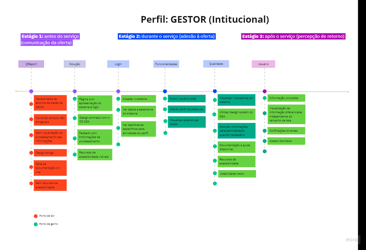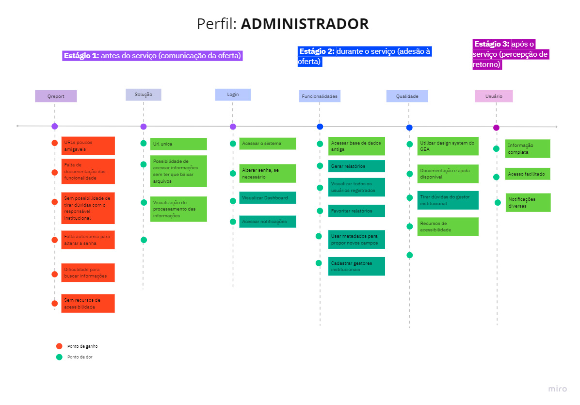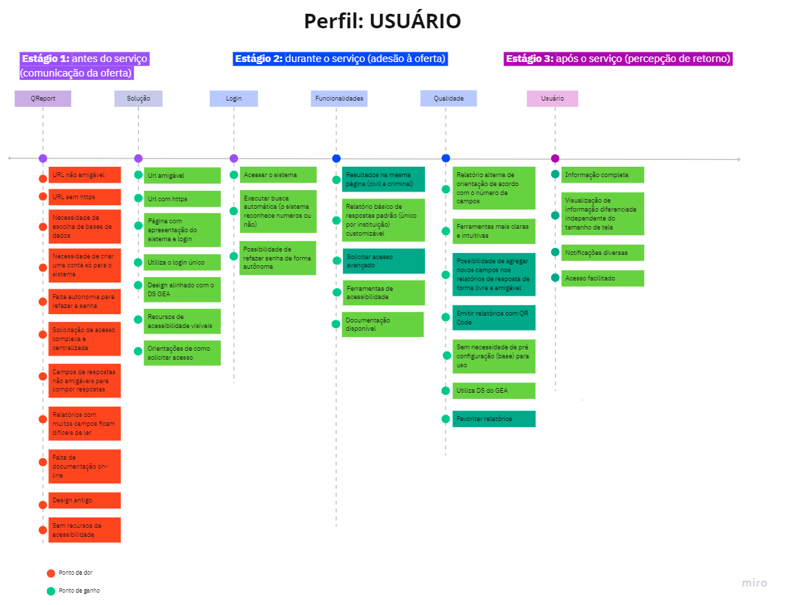 A partir de cada marco em seus respectivos estágios, é possível fazer a leitura de cada procedimento em ordem de ocorrência que será precorrido pelo usuário. Cada um deles sinalizado por uma cor: verde (ponto de ganho) ou vermelho (ponto de dor)